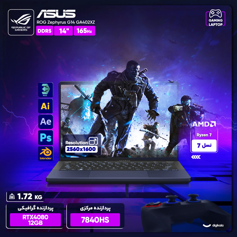 لپ تاپ 14 اینچی ایسوس مدل ROG Zephyrus G14 GA402XZ-CS94-R9 7940HS-16GB DDR5 4800MHz-1TB SSD-RTX4080 12GB-QHD 165Hz-W