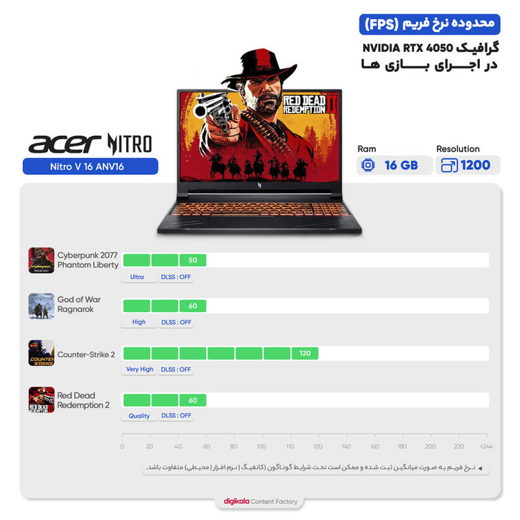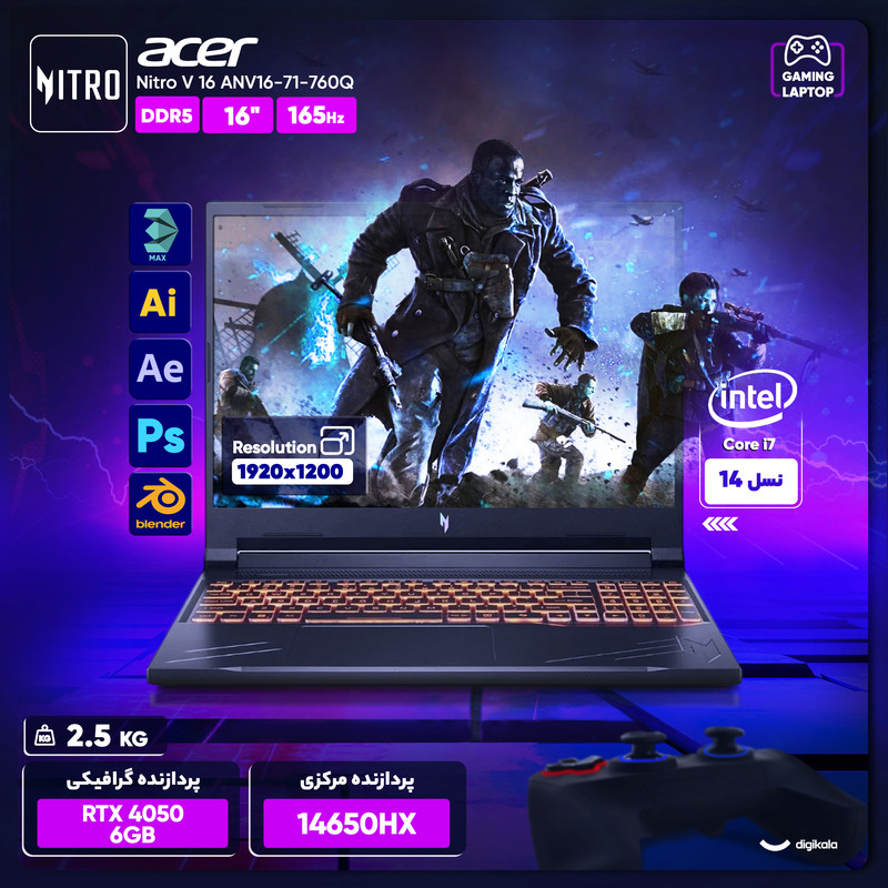 لپ تاپ 16 اینچی ایسر مدل Nitro V 16 ANV16-71-760Q-i7 14650HX-16GB DDR5 5600MHz-512GB SSD-RTX4050-FHD 165Hz